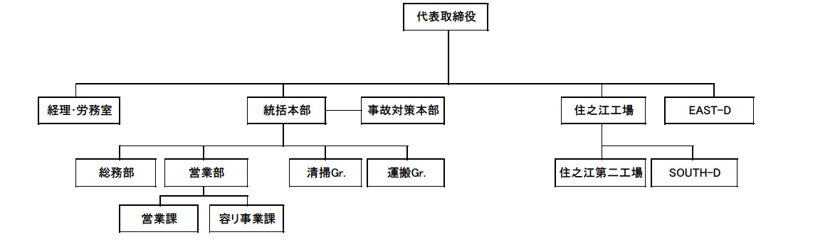 | 事業内容 | ①一般廃棄物の収集・運搬業(大阪市・東大阪市) ②産業廃棄物の収集運搬業、中間処理業 ③特定建設業(大阪府知事(特-6)第015961号) ④プラスチック製容器包装の再生処理事業 ⑤合成樹脂資材の製造・販売 ⑥ビルメンテナンス業 ⑦一般貨物自動車運送業 |