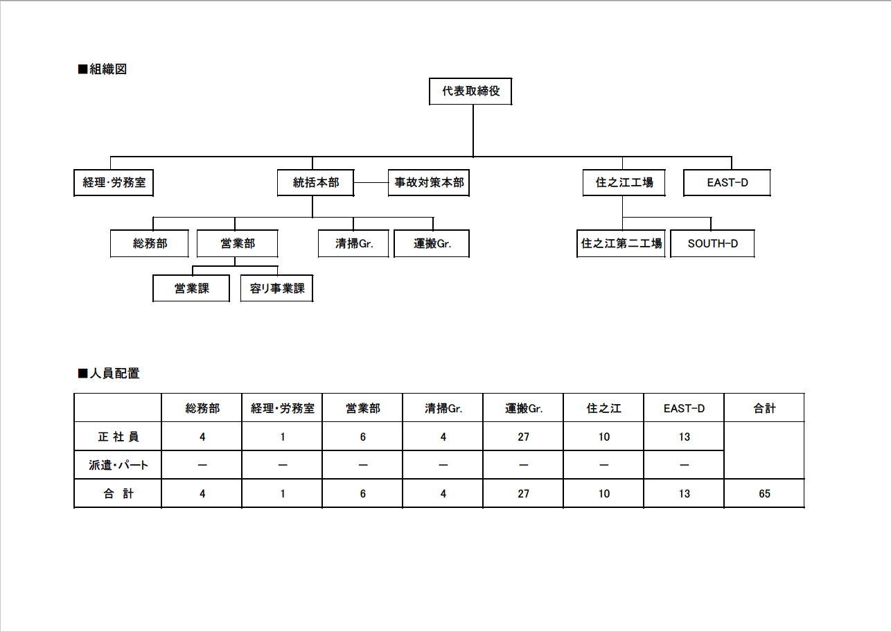 | 事業内容 | ①一般廃棄物の収集・運搬業(大阪市・東大阪市) ②産業廃棄物の収集運搬業、中間処理業 ③特定建設業(大阪府知事(特-6)第015961号) ④プラスチック製容器包装の再生処理事業 ⑤合成樹脂資材の製造・販売 ⑥ビルメンテナンス業 ⑦一般貨物自動車運送業 |